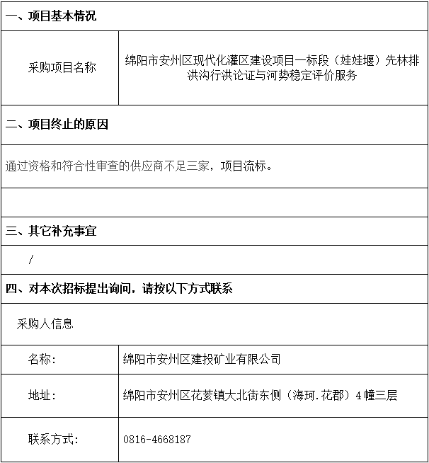 綿陽(yáng)市安州區(qū)現(xiàn)代化灌區(qū)建設(shè)項(xiàng)目一標(biāo)段(娃娃堰)先林排洪溝行洪論證與河勢(shì)穩(wěn)定評(píng)價(jià)服務(wù)流標(biāo)公告