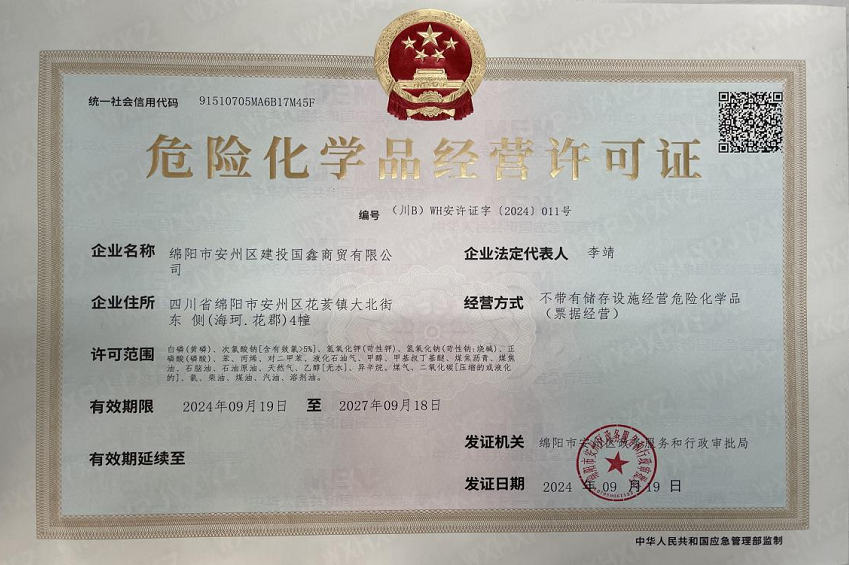 此次取得《危險化學(xué)品經(jīng)營許可證》,不僅是對國鑫商貿(mào)專業(yè)能力和管理水平的認可,也是對公司一直以來秉持的誠信經(jīng)營、客戶至上經(jīng)營理念的肯定。